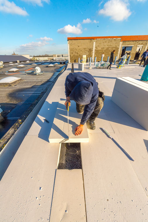 Workers installing insulation panels on a flat rooftop under a blue sky.