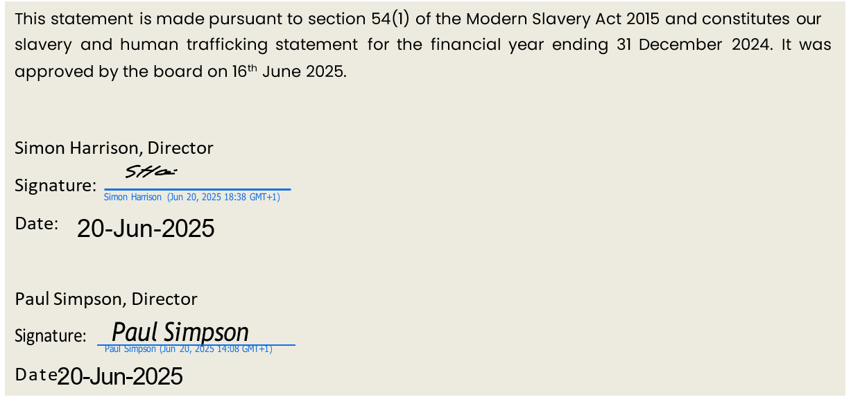Our anti-slavery policy, which forms part of our wider Group Code of Conduct, reflects our commitment to acting ethically and with integrity in all our business relationships and to implementing and enforcing effective systems and controls to ensure slavery and human trafficking is not taking place anywhere in our supply chains.