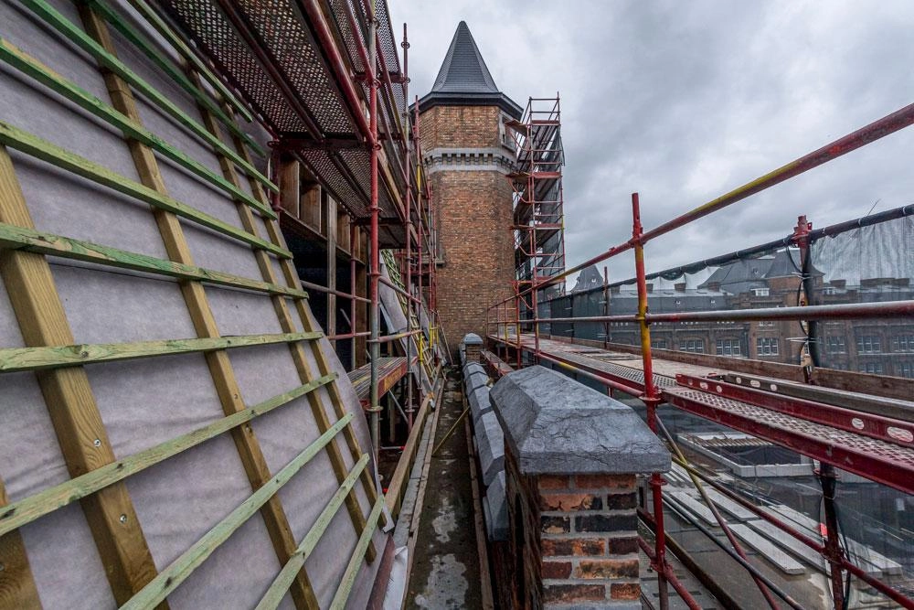 L'entrepreneur Toitures Naessens, en collaboration avec B2Ai Architects, rénove le toit de la caserne Léopold à Gand.