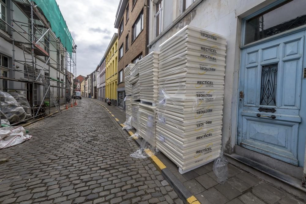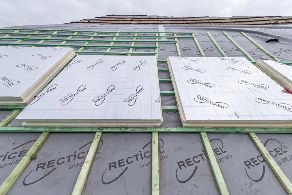 Het na-isoleren van een hellend dak aan de buitenzijde is bouwfysisch het meest ideaal. Met Euroroof isolatieplaten, Rectivent onderdakfolie en Rectifix schroeven maakt Recticel het ons zo gemakkelijk mogelijk: alles kan inééns besteld worden: je kunt dus een gemakkelijke en ook een kostefficiënte installatie garanderen aan je klant. Hier kozen wij voor het vierkant formaat: 1200 x 1200 mm en een dikte van 120 mm: zo kunnen we het snijafval op de werf beperken. Iedereen tevreden dus.
