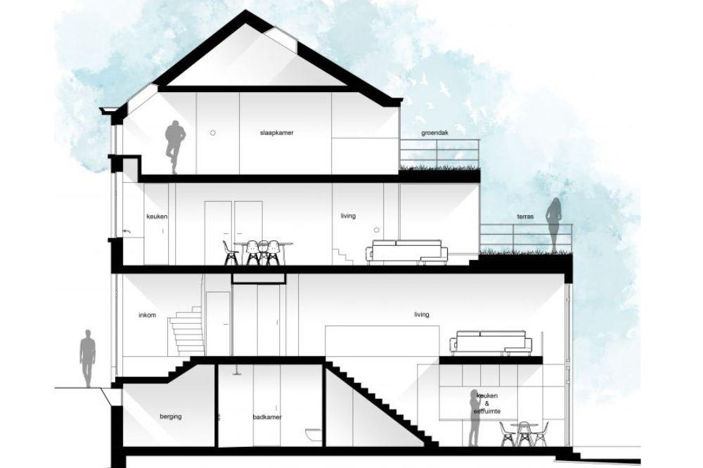 Niets aan dit huis is standaard, voortdurend is gezocht naar efficiëntie, logica en detail. Elke m² is uitgepuurd. Met dank aan de aannemers die de architecten hierin hebben gevolgd. De nieuwe draagvloeren zijn vervaardigd uit industriële staalbetonvloeren die zichtbaar blijven.
