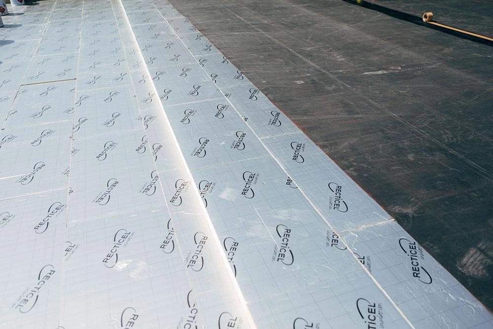 In basis is het aanbrengen van afschotisolatie heel eenvoudig. Dat begint met het leggen van een vlakke onderplaat. Daar bovenop komen afschotplaten, in diktes verlopend van bijvoorbeeld 2-4 cm, 4-6 cm, 6-8 en 8-10 cm. Meestal volstaan die vier verschillende diktes. Als het dak nog langer is en dus meer afschot heeft, dan lost Recticel dat op door een dikkere onderplaat toe te passen. Dat is prijstechnisch interessanter dan een dikkere afschotplaat en vereenvoudigt het legplan. Voordeel van de combinatie van een vlakke onderplaat met een afschotplaat is ook dat ze in halfsteensverband kunnen worden gelegd, wat doorlopende naden voorkomt.
