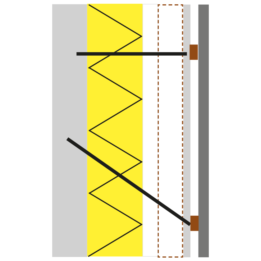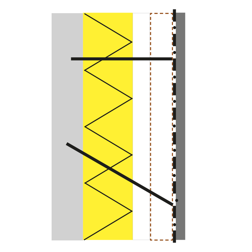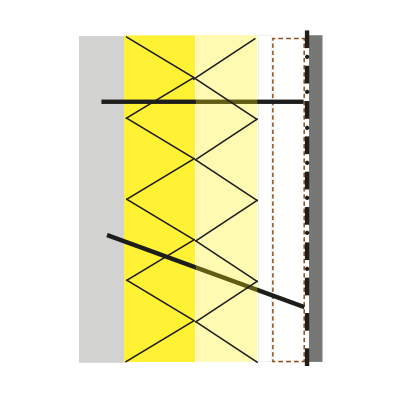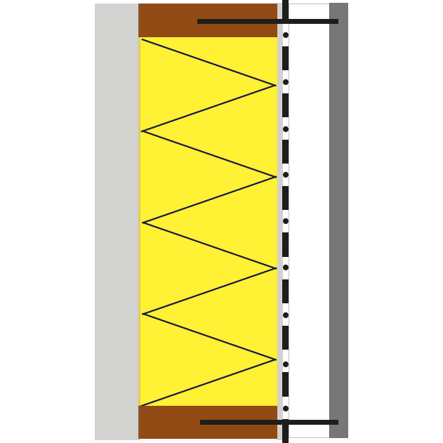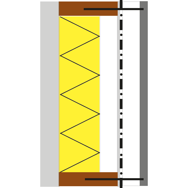 Warmte weerstanden van alle lagen na en incl. de sterk geventileerde luchtlaag vervallen. Een spouw is sterk geventileerd als metselwerk wordt uitgevoerd zonder stootvoegen. Buiten overgangsweerstand komt overeen met stilstaande lucht 0,12 (0,22 met reflectie. NTA 8800:2022 C.3.3 (p. 751); Tabel C.3 (p. 754)